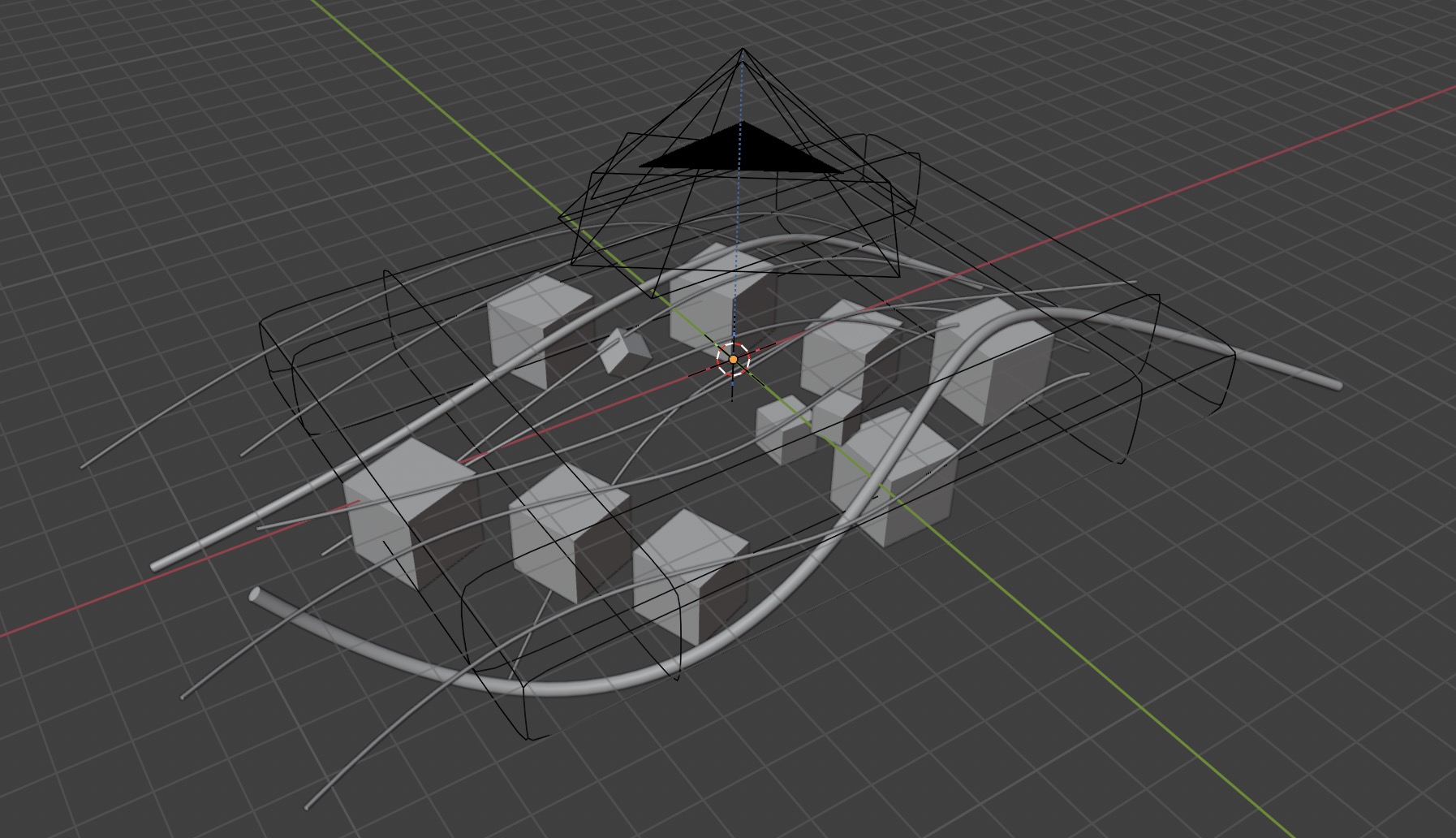 While fooling around with one of these dispersion shaders, I tried setting its default IOR to a ridiculous value that had absolutely no relation to real-world optics, and the result of that blew my mind. Everything behind that surface became wonderfully ethereal, as light itself seemingly got peeled away to infinity. Inspiration struck, and I laid out a scene with glowing filaments and inert blocks that would artfully obstruct the beams of light. I used Blender's compositor to replace the strict RGB channels with some blue/orange complementary colors to create the final image.