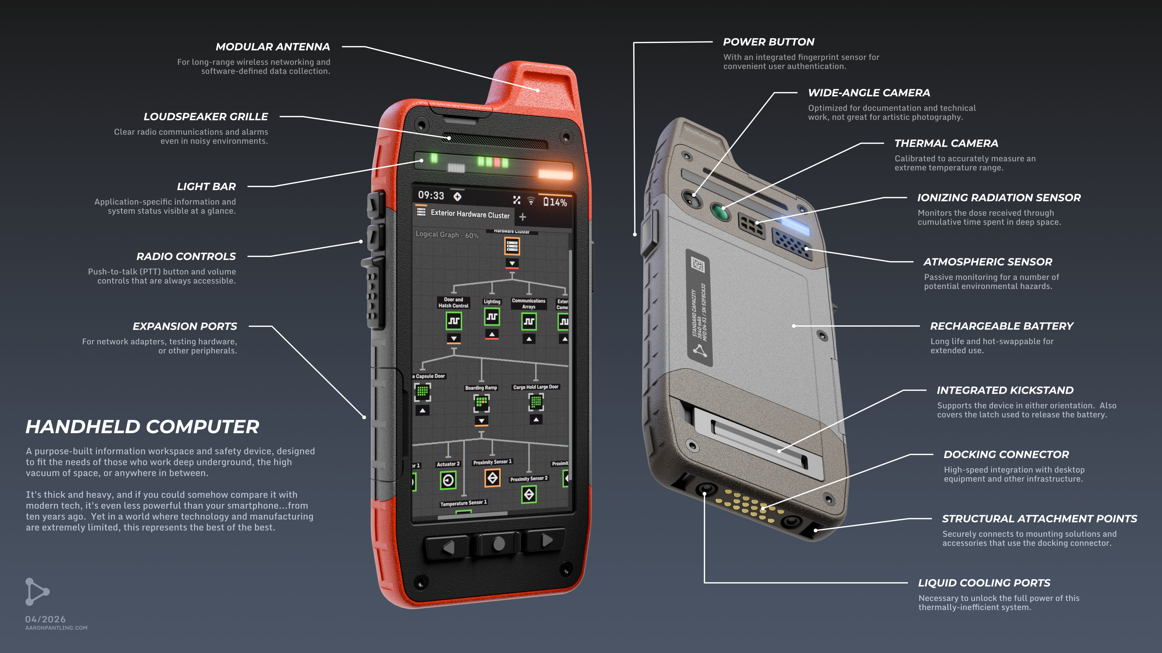 A purpose-built information workspace and safety device, designed to fit the needs of those who work deep underground, the high vacuum of space, or anywhere in between. It's thick and heavy, and if you could somehow compare it with modern tech, it's even less powerful than your smartphone...from ten years ago. Yet in a world where technology and manufacturing are extremely limited, this represents the best of the best.
