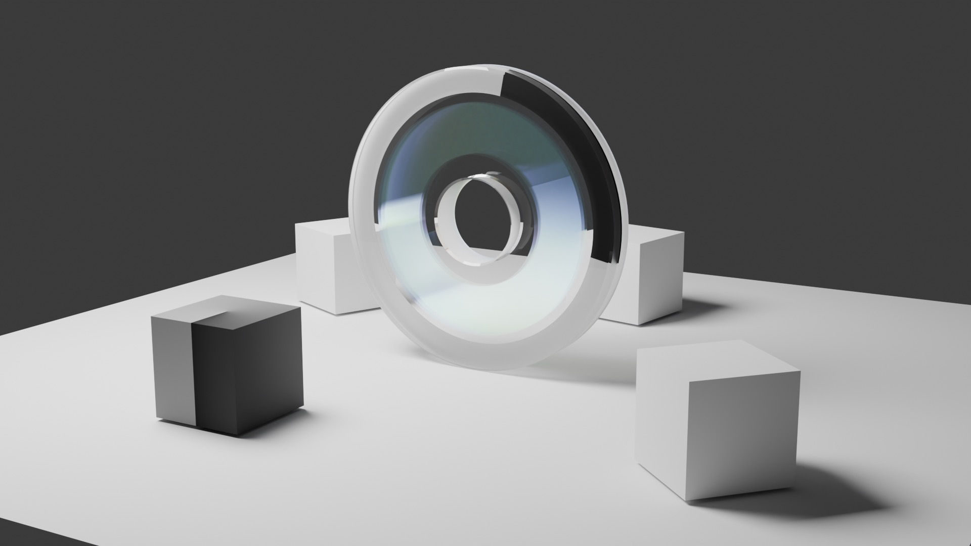 The hardest part about this, by far, was crafting the exotic optical behavior of the data layer inside the disc. Being an experimental technology, there isn't much reference imagery available of the real thing, and from what I could find, the effect tended to be kind of subtle and boring anyway. The striking rainbow effects of a CD or DVD come not from the data on them but from diffraction on a continuous spiral groove pressed into the polycarbonate substrate. My base media doesn't have that, so the radial patterns here come from the varying relative orientation of the nanostructures used to encode data. Light passing through or reflecting off that layer might be diffracted in any direction, with constructive and destructive interference producing different colors in every single direction.