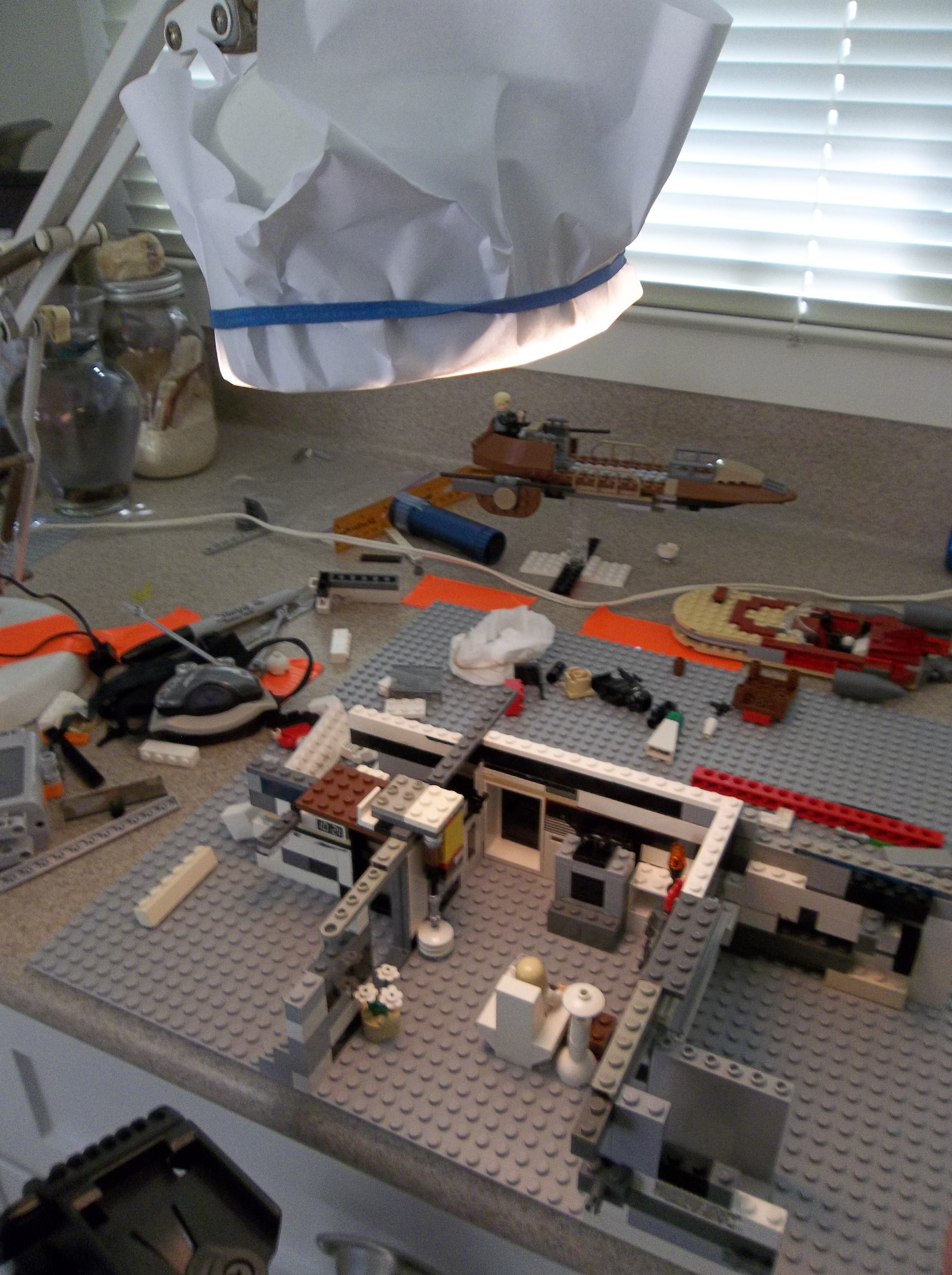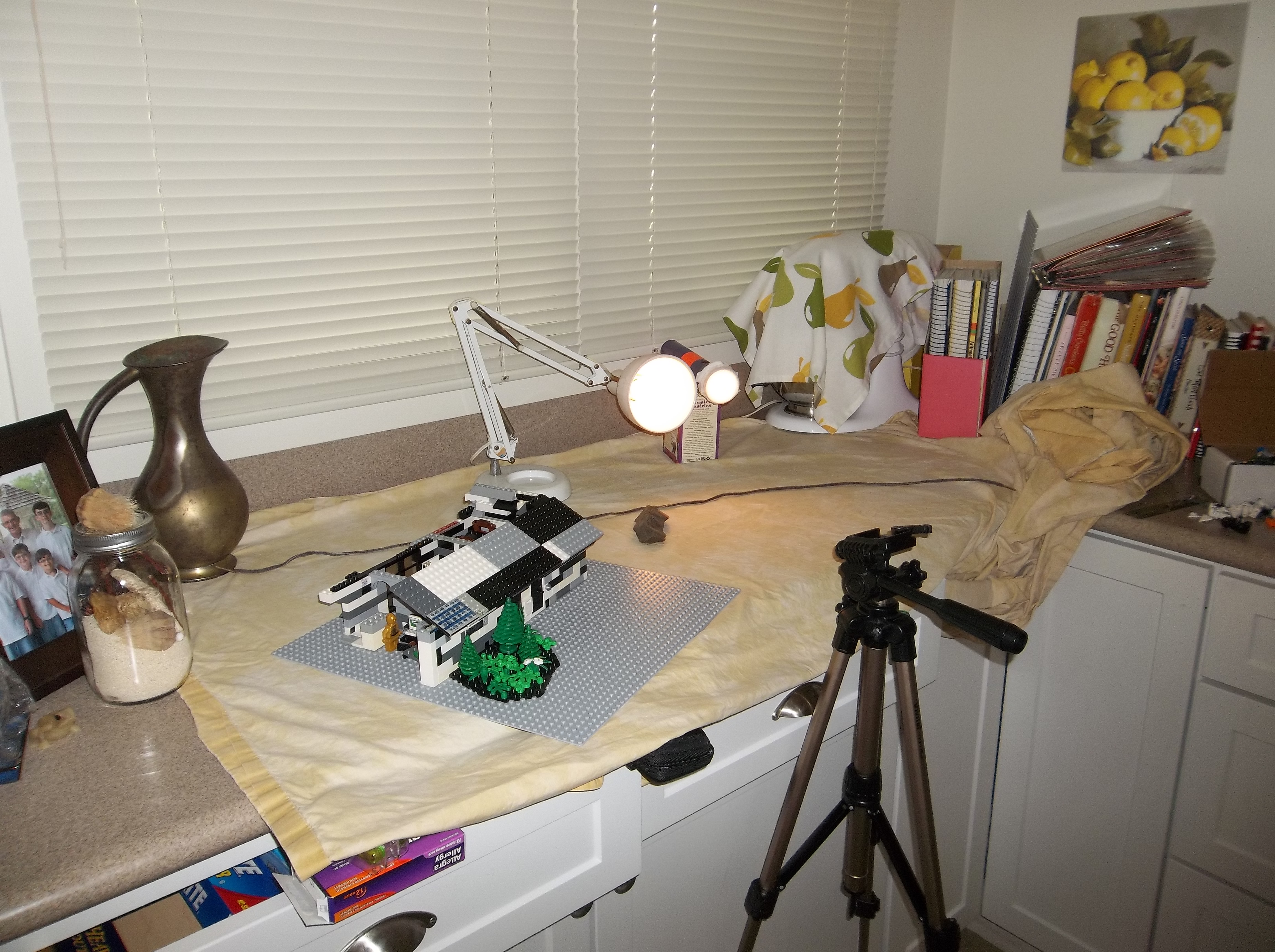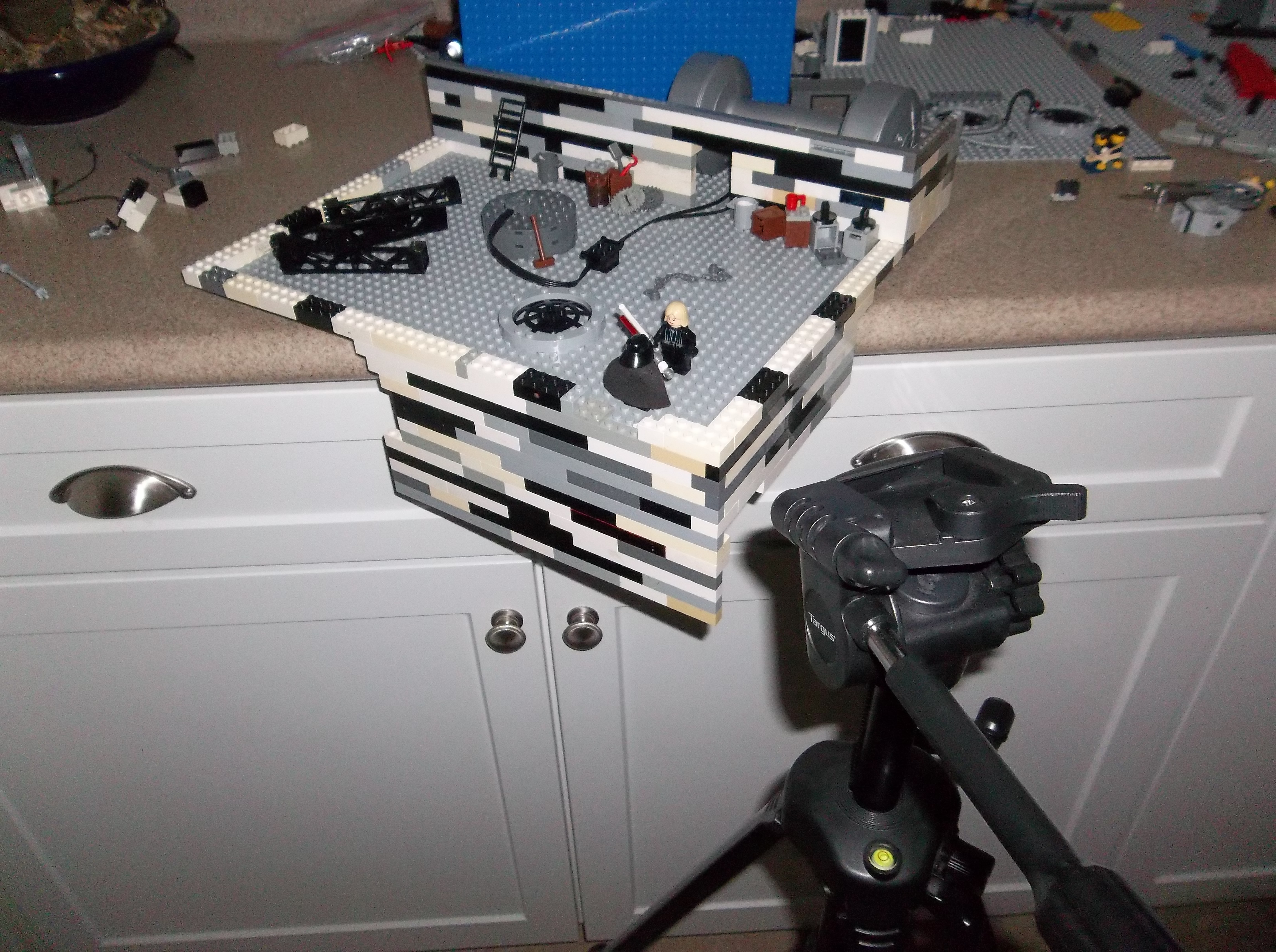 My brother and I started production in August 2012, assembling sets one at a time on the kitchen countertop and shooting stop-motion footage with minifigs and vehicles. We did the best we could with the resources we had, but in hindsight it was barely enough. My inexpensive point-and-shoot digital camera had no auto-focus or auto-exposure lock, nor the ability to remotely trigger the shutter. The self-timer feature helped a lot, but I still had to touch the camera every single frame. A tripod helped with stability, and we developed some other tricks like securing the camera to a platform or sled using sticky office putty, but those couldn't help the limitations of the camera itself. Small wonder most stop-motion is filmed using DSLRs with full manual control.